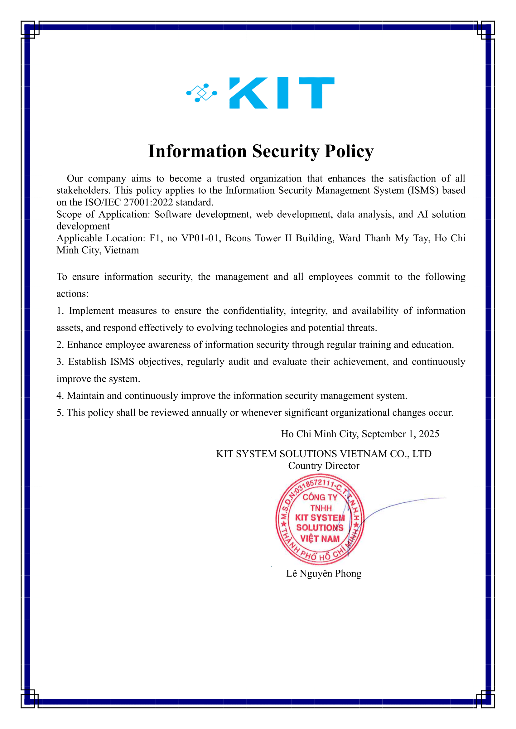 K.I.T KIT System Solutions Vietnam (hereinafter referred to as “K.I.T”) hereby establishes this Privacy Policy (hereinafter referred to as “this Policy”) regarding the handling of customers’ personal information in relation to the services (hereinafter referred to as “the Services”) provided on this website.